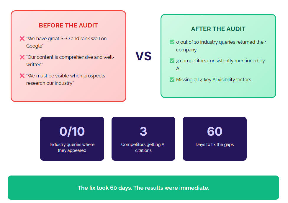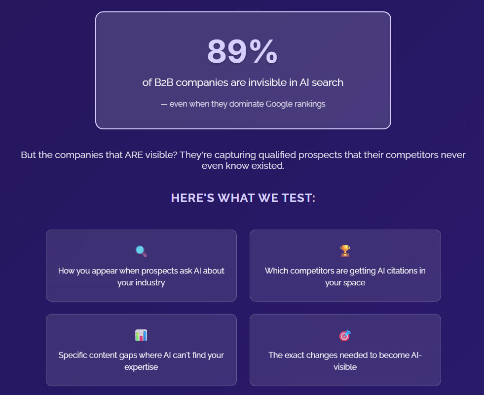 But the companies that ARE visible? They're capturing qualified prospects that their competitors never even know existed.Here's what we test:How you appear when prospects ask AI about your industry