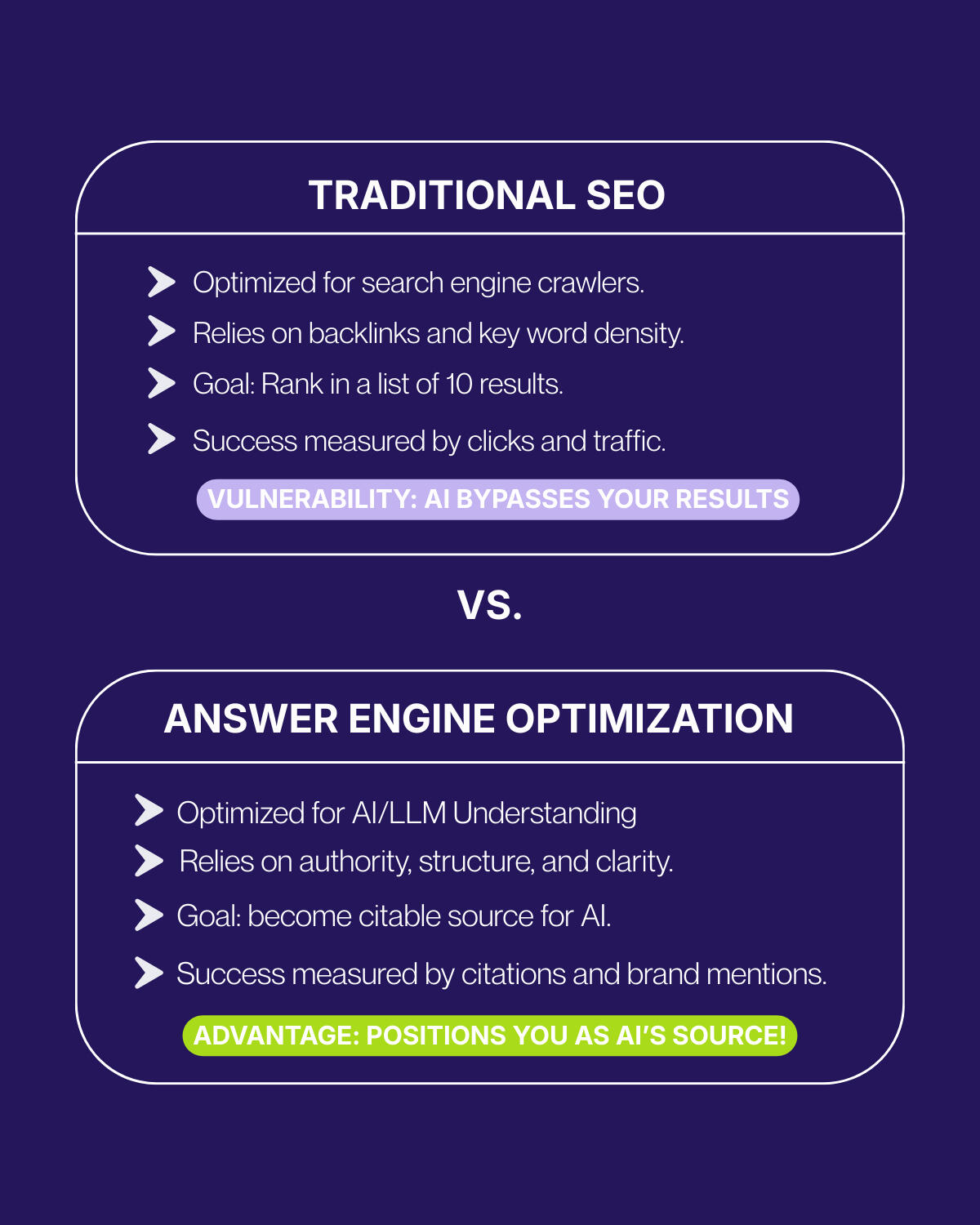 Which is why you need to be both SEO and AEO to be successful. SEO keeps you visible in traditional search. AEO makes you citable when AI delivers the answer.We Built a Tool to Answer These QuestionsOur audit shows you where your site stands on both—and exactly what to improve. Companies that score above 80% on our AI Readiness framework see 3x more AI citations than those below 60%.