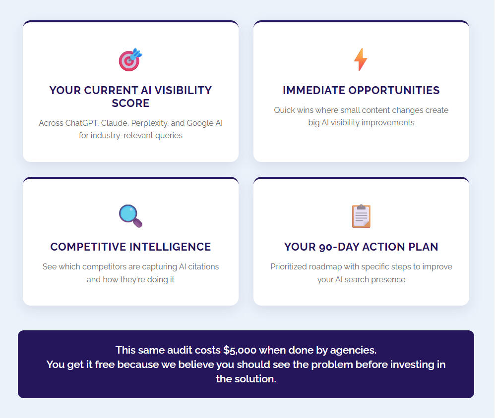 🔍Your Current AI Visibility Score⚡ Immediate Opportunities🎯 Competitive Intelligence📋 Your 90-Day Action Plan