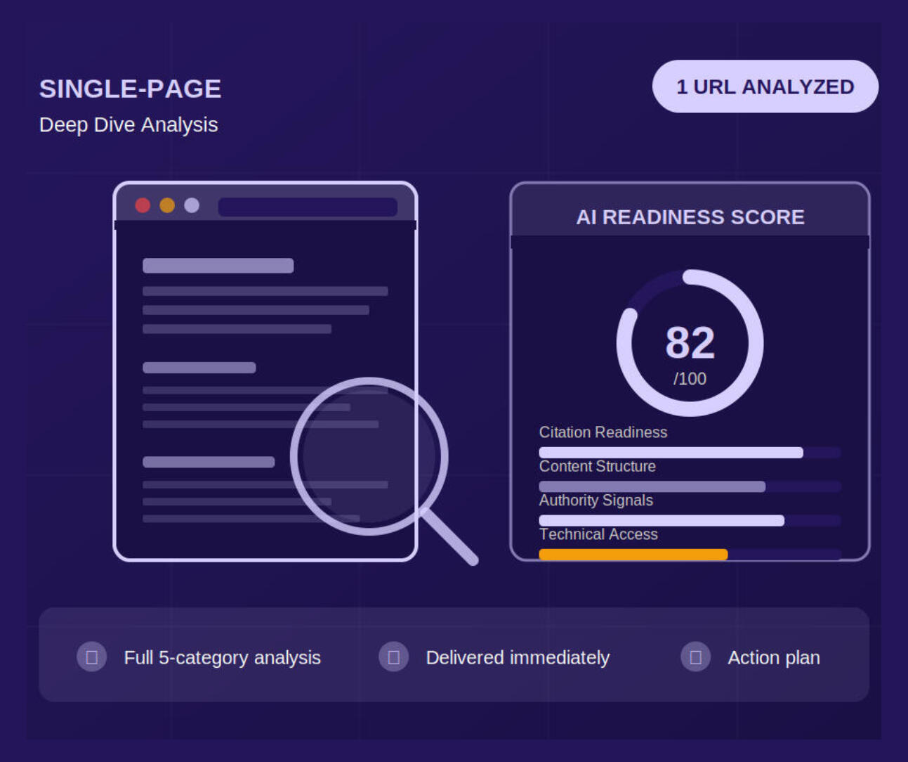 Perfect for analyzing your most important page—a key landing page, product page, or cornerstone blog post. Get a complete AI readiness score with specific recommendations for that single URL.Includes: