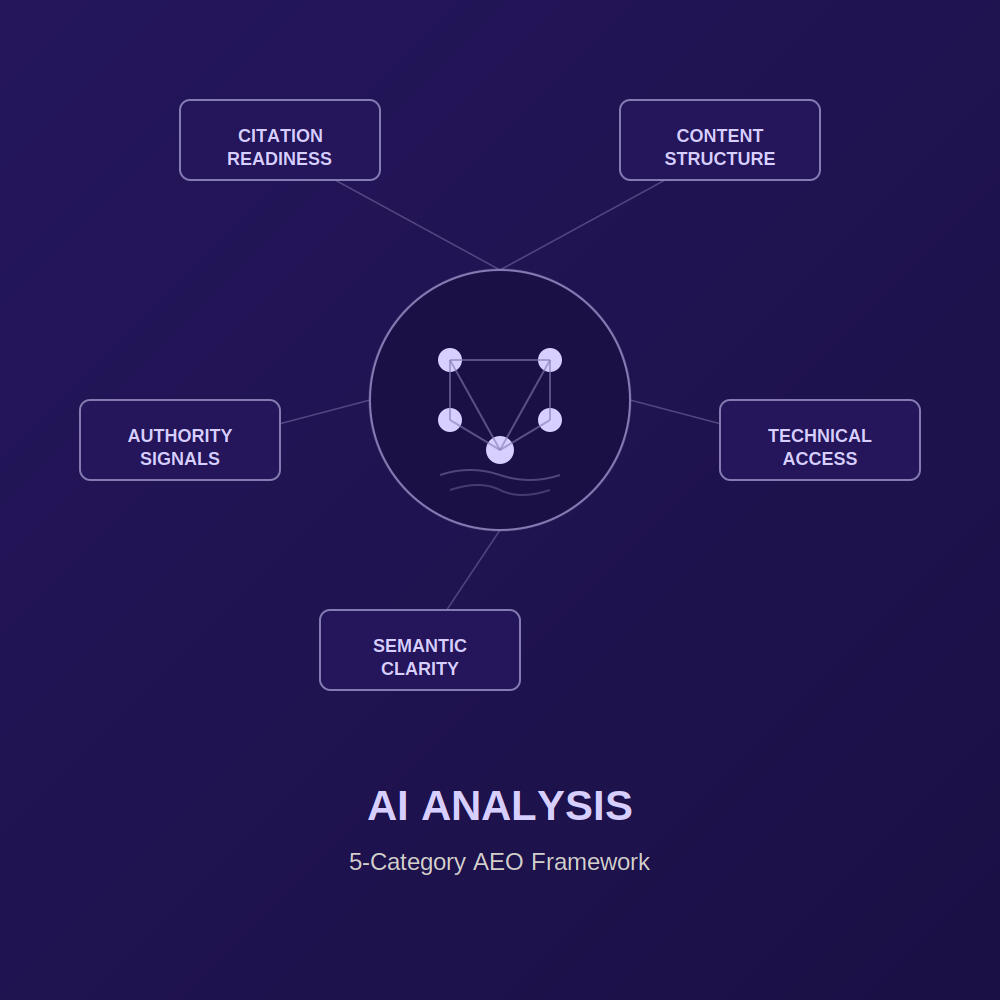 Our audit analyzes whether your site is optimized for AI engines—meaning we assess whether AI can access, understand, and cite your content. This is the foundation for appearing in AI answers.What's your 5-category AEO framework?
